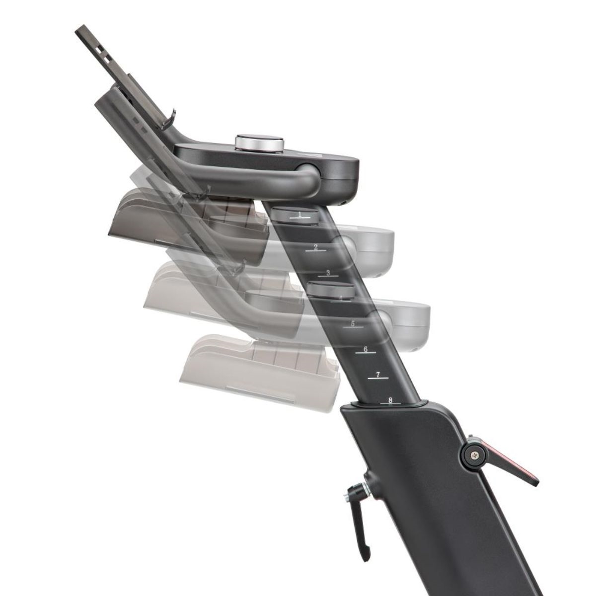 Den justerbare tablettholderen gir optimal synsvinkel til treningsapper og klasser, mens flaskeholderne holder deg hydrert.