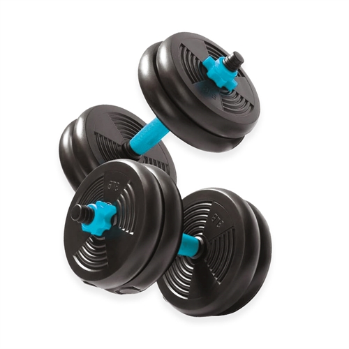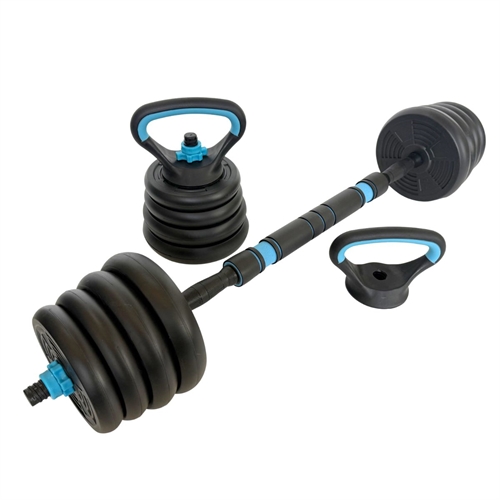 Settet består av 29 kg vektskiver (1,25 kg, 1,5 kg, 2 kg og 2 kg – fire av hver), to korte vektstenger à 47 cm som enten kan brukes som manualer eller kobles sammen til en lang vektstang med det medfølgende 40 cm koblingsstykket. Du får også med en kettlebell-bar med bunnstykke samt to push-up-håndtak, som også fungerer som grep til kettlebell-oppsettet. Fire låseringer holder skivene trygt på plass under treningen.