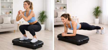 En av fordelene med vibrasjonstrening er at mange klassiske øvelser kan utføres på platen. Her er noen av de mest populære øvelsene på vibrasjonstrener. Hvis du er ny til vibrasjonstrening, kan du starte med et enkelt vibrasjonstreningsprogram på 10 minutter:
