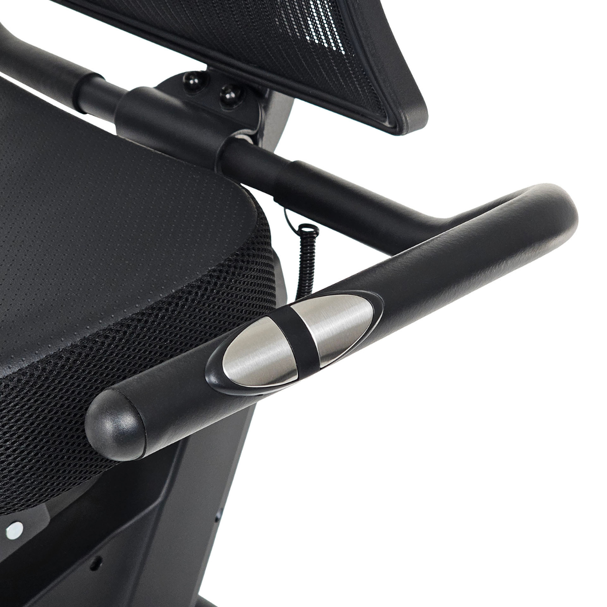 Den pustende mesh-ryggen støtter kroppen og gir en avslappet, ergonomisk sittestilling. Støttehåndtaket gir ekstra sikkerhet ved av- og påstigning.
