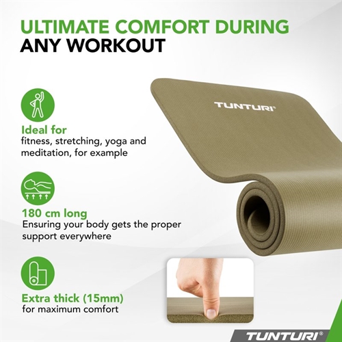 Den 15 mm tykke overflaten reduserer trykkpunkter og gir maksimal komfort ved både yoga og styrketrening.